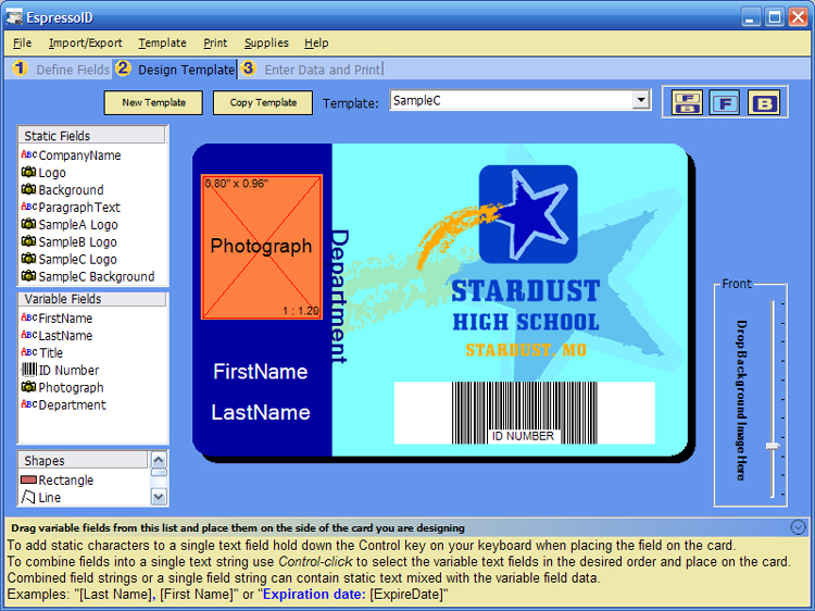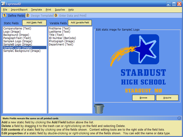 The first tab is for setting up the general fields you want on your cards. The Static Fields list contains the list of fields that will remain the same between cards. The most common of these is Company/School Name and Background image. Since the company or school name is likely to show up on every card you print this is where you create the field. Once you've added the fields you want you can click on them in that list and you will be given the opportunity to tell EspressoID what data they should contain (over on the right side of the screen). Click on Company Name and on the right half of EspressoID will turn into a text box where you can type your company name.
