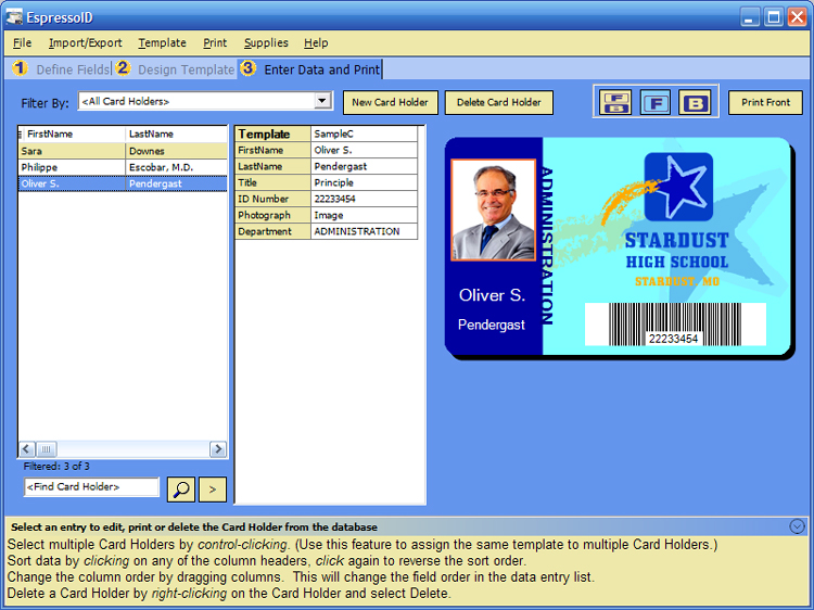 It's on tab 3 where you fill in the data for the Variable Fields. Here is where you would fill in the First Name field with "Bob" and the Last Name field with "Smith". There are buttons on that tab for creating a new card holder or deleting one you no longer need. The first thing you should do when you create a new card holder is select the card template that applies to that person. When a school uses our software they often have quite a few templates, one for each grade level and one or more for the staff. After selecting the template you should see the data appear on the card as you fill out each of the variable fields. You can use the buttons in the upper right to show just the front of the card (F), just the back of the card (B) or both (FB). The side that is showing is the side that will be printed when you click the print button.
